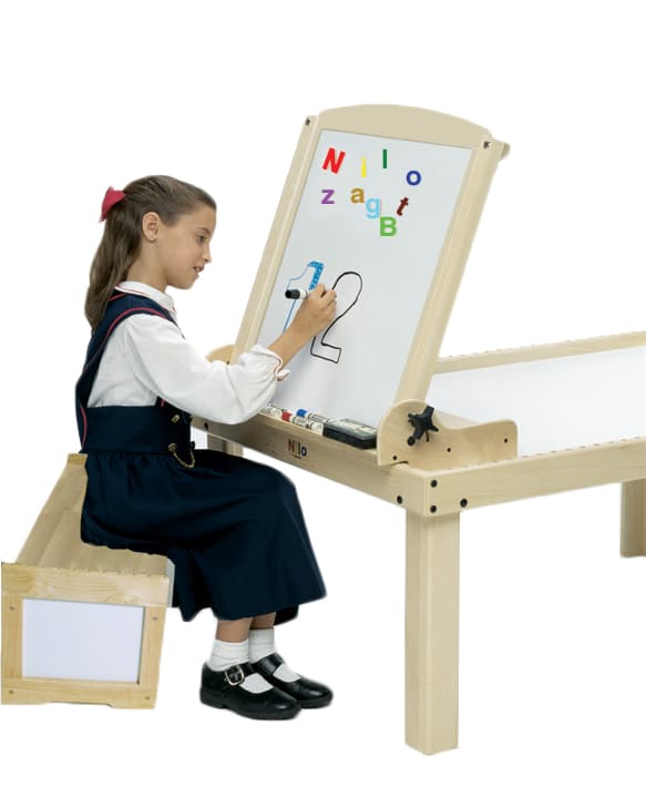 Morgan is also shown drawing with dry erase markers on our Nilo Theasel (in the right photo), which locks into place on any of our Nilo Activity Tables for increased stability!