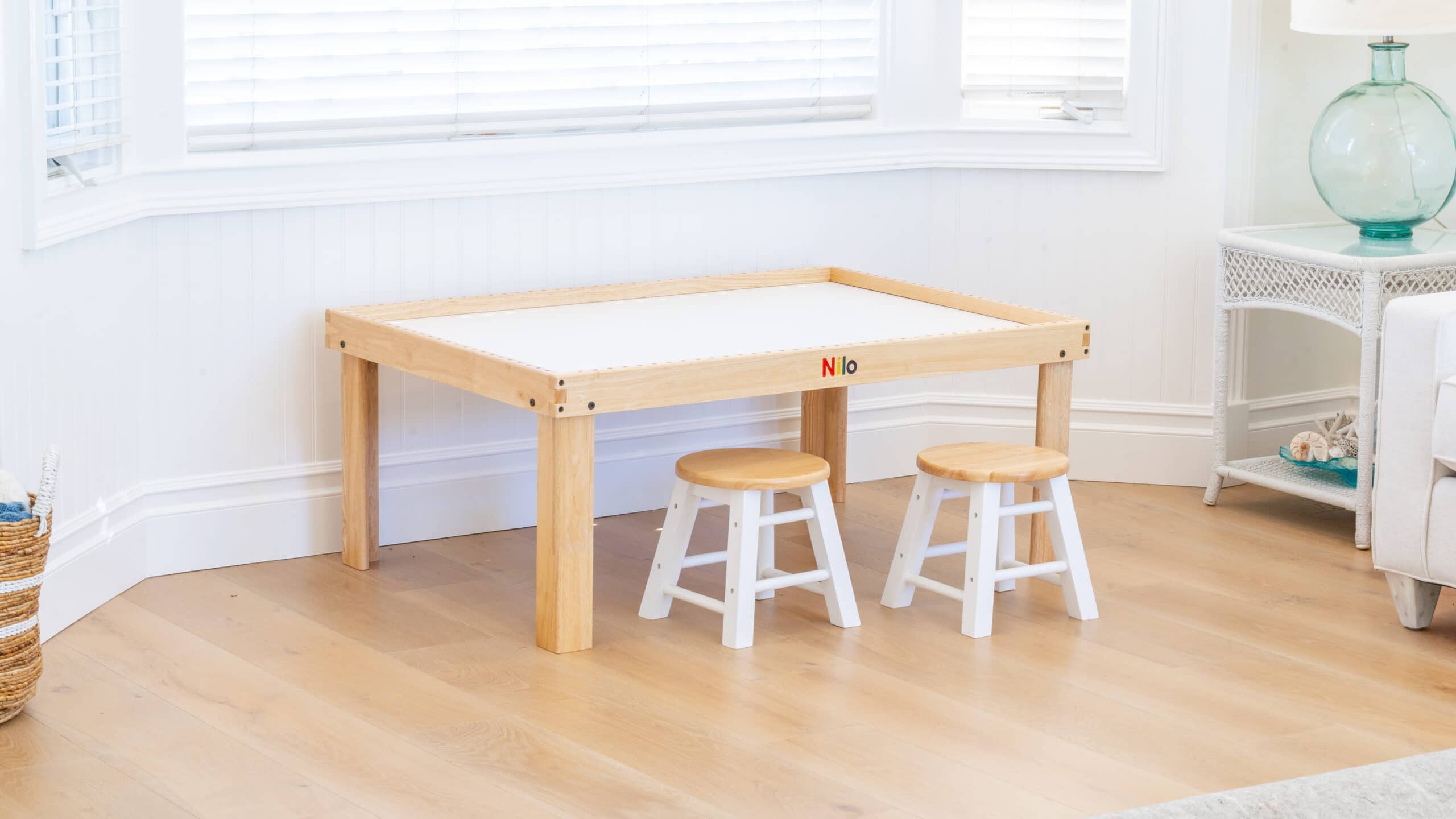 My kids age 5, 3, and 1 all love our Nilo table. We usually have two Lego plates on half of the table and have the other half open to play. This table is wonderful for trains, Legos, play-doh, coloring, Calico critters village and much more. It’s great because they can either stand or sit with the Nilo stools at the table. This table is very well made and seems like it will last a very long time!